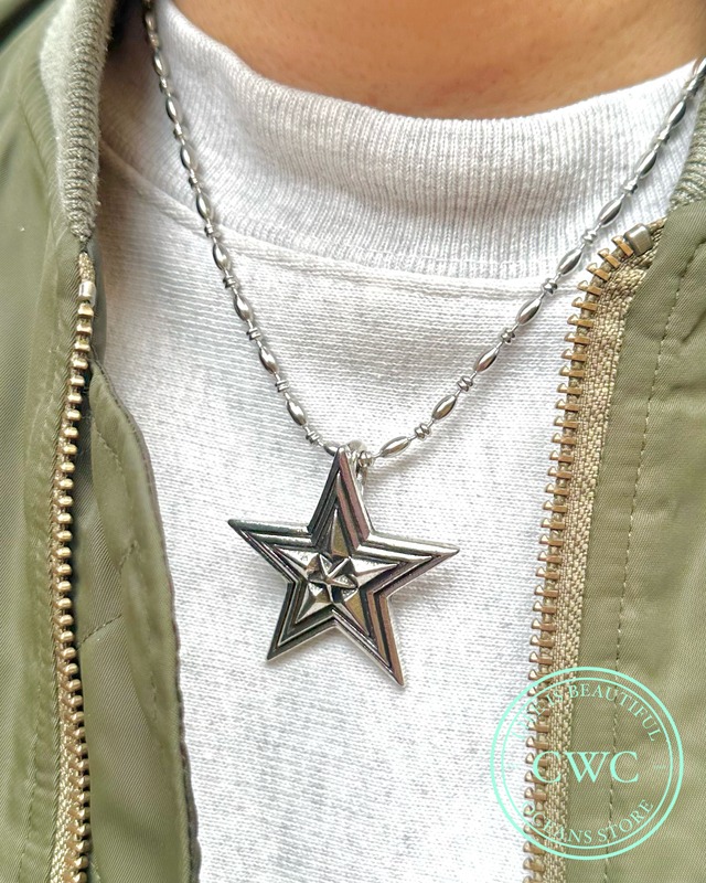 【ステンレス製ビックスターネックレスver.1】 存在感があり、スターのしっかりした彫りが特徴的なネックレス。インディアンジュエリーが好きな方にオススメです☆ ・チェーンもボックスチェーンを使い、他とは違うデザインがチェーンだけでの着用にも活躍します。 ・しっかりとした重量があり、日常コーデに高級感を与えてくれる★ネックレスです。 ○サイズ○ スター 約45mm*45mm ステンレス製のボックスチェーン50cm ☆オプションで右側のレザー紐にホワイトハーツビーズを通した星条旗カラーバージョンにも変更できます!レザー紐は胸元下ぐらいにくるように長めにお作り致します!! 存在感バツグンのスターアイテムです!! オプションのホワイトハーツ星条旗カラーバージョンに変更はプラス¥800-で出来ます✨別ページの[optin ホワイトハーツ仕様]からご購入お願いします。 こちらのペンダントはプレゼントにも最適な素材…ステンレス製となっております!特徴としてはシルバーと違いアレルギー反応を起こしにくく、汚れたりくすんだりし難くお肌が弱い方にもオススメです! ○注意事項○ アレルギーが絶対に起きないわけではございません。ごく稀にステンレス製でもお肌に合わない方もいます。 ★INFORMATION もお読みください。