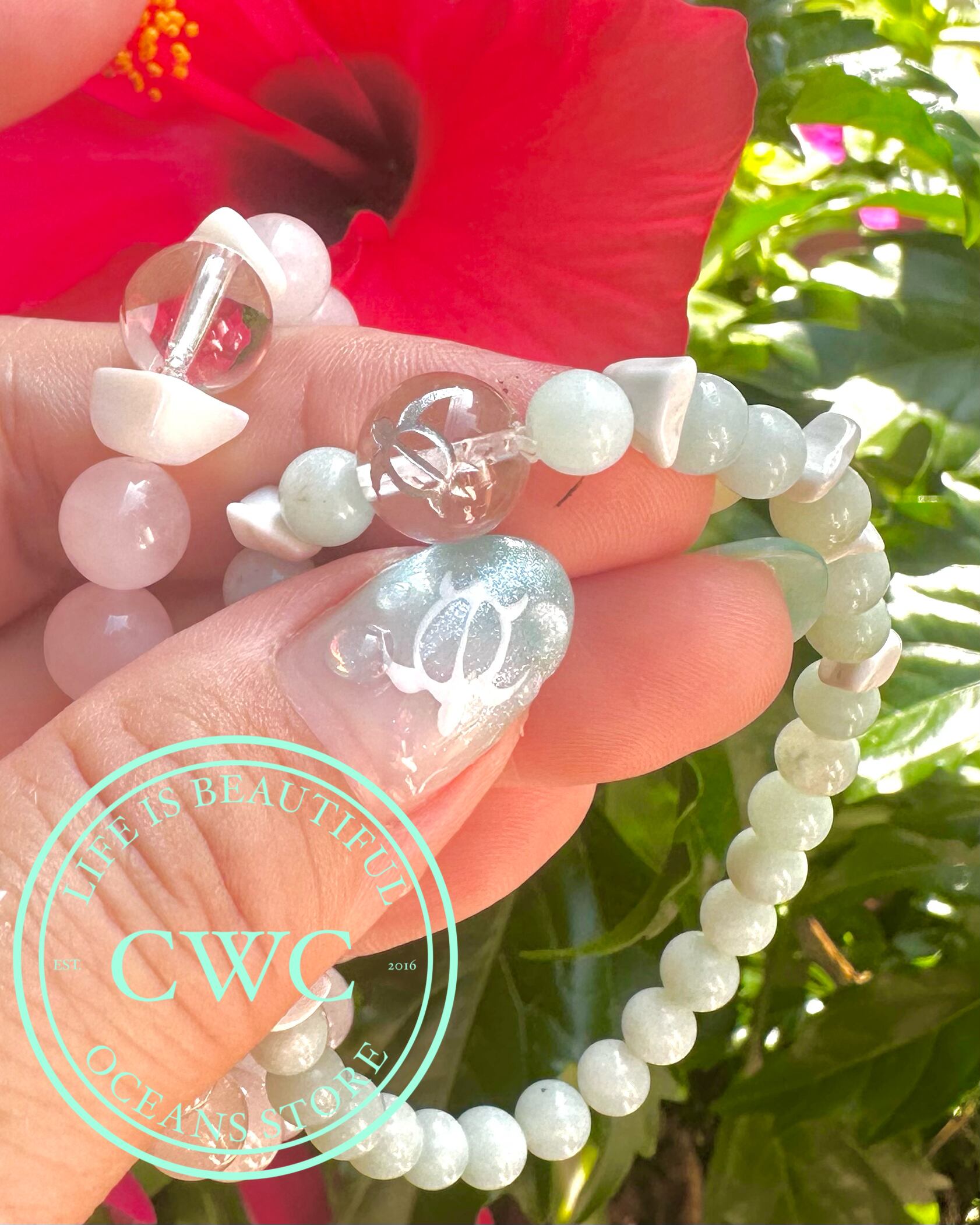 ★ハワイをイメージしたカラフルな天然石にハワイでは神聖な生き物とされるホヌ(海亀)を施した、水晶を組み合わせた一点もののブレスレットを造りました。ラニカイビーチの海の水面を思わせるアマゾナイトを使用⭐︎また可愛いビーチ沿に咲く花をイメージしたのとても美しいローズクォーツを使用⭐︎