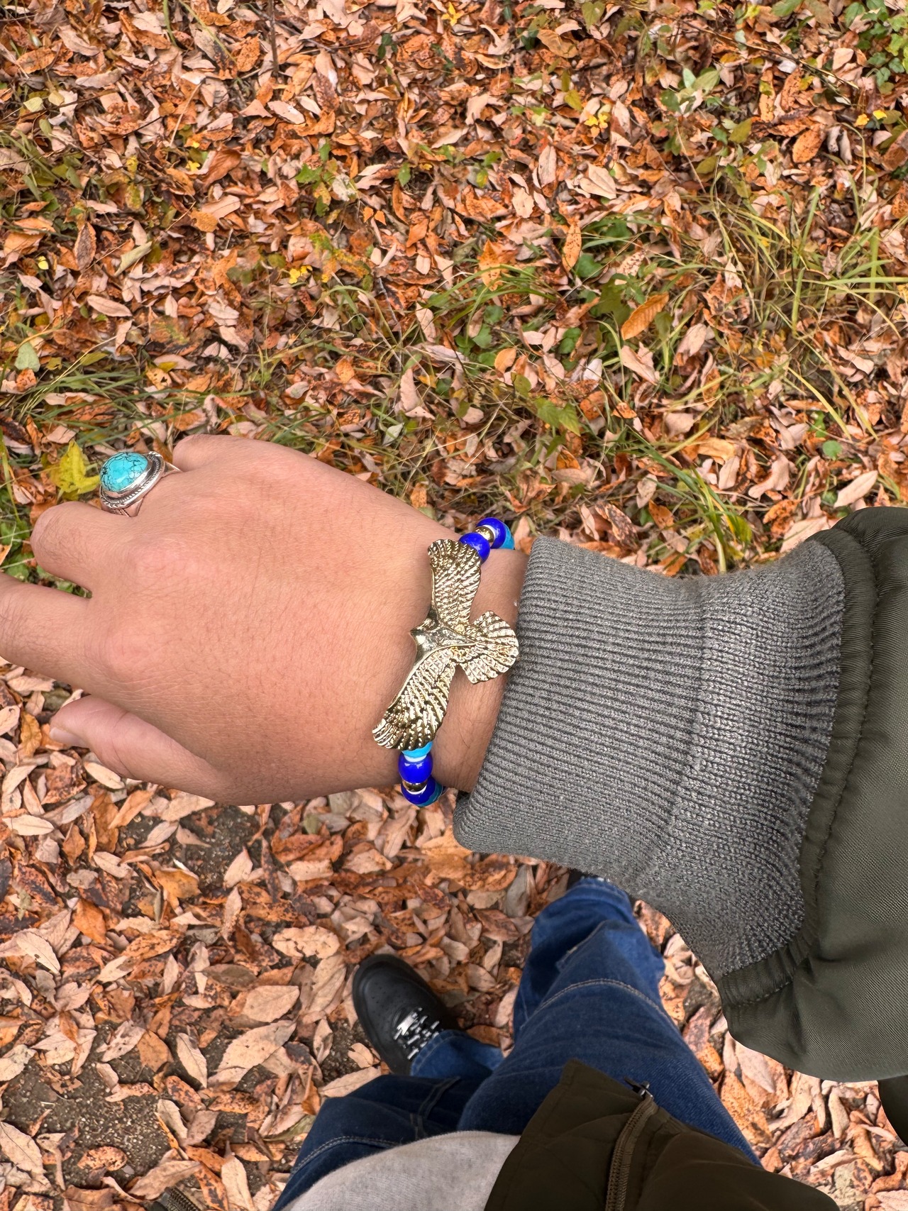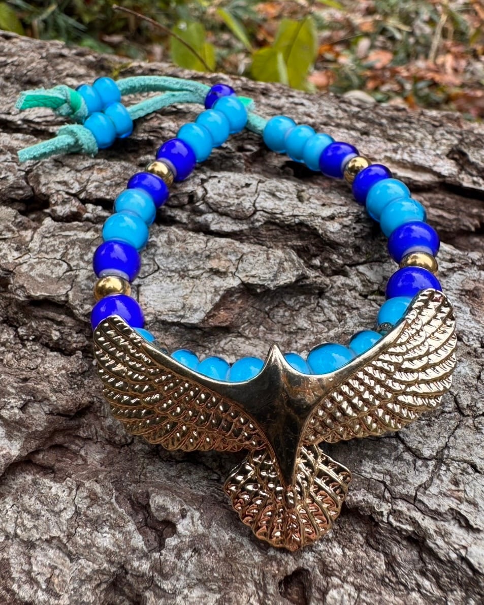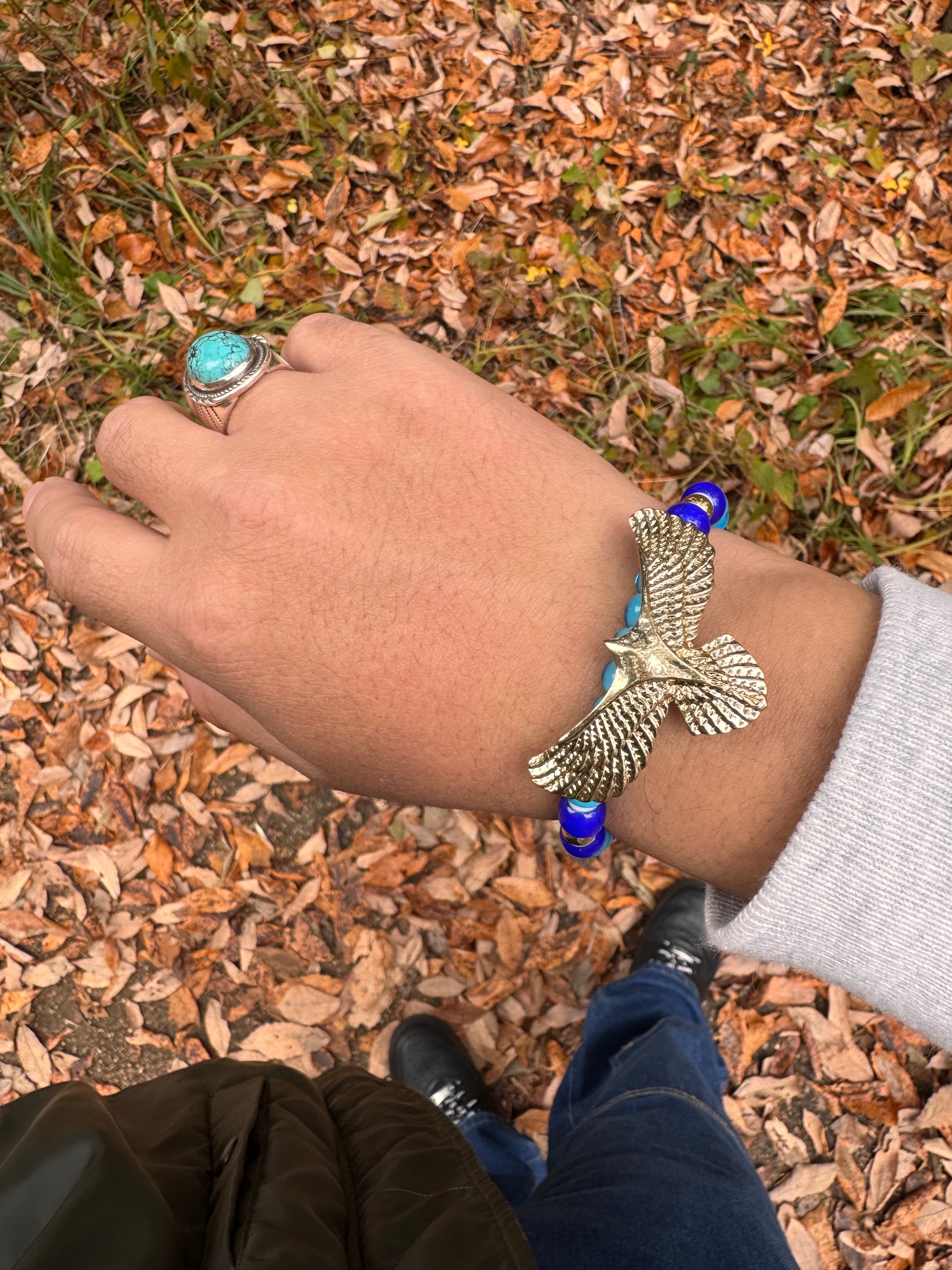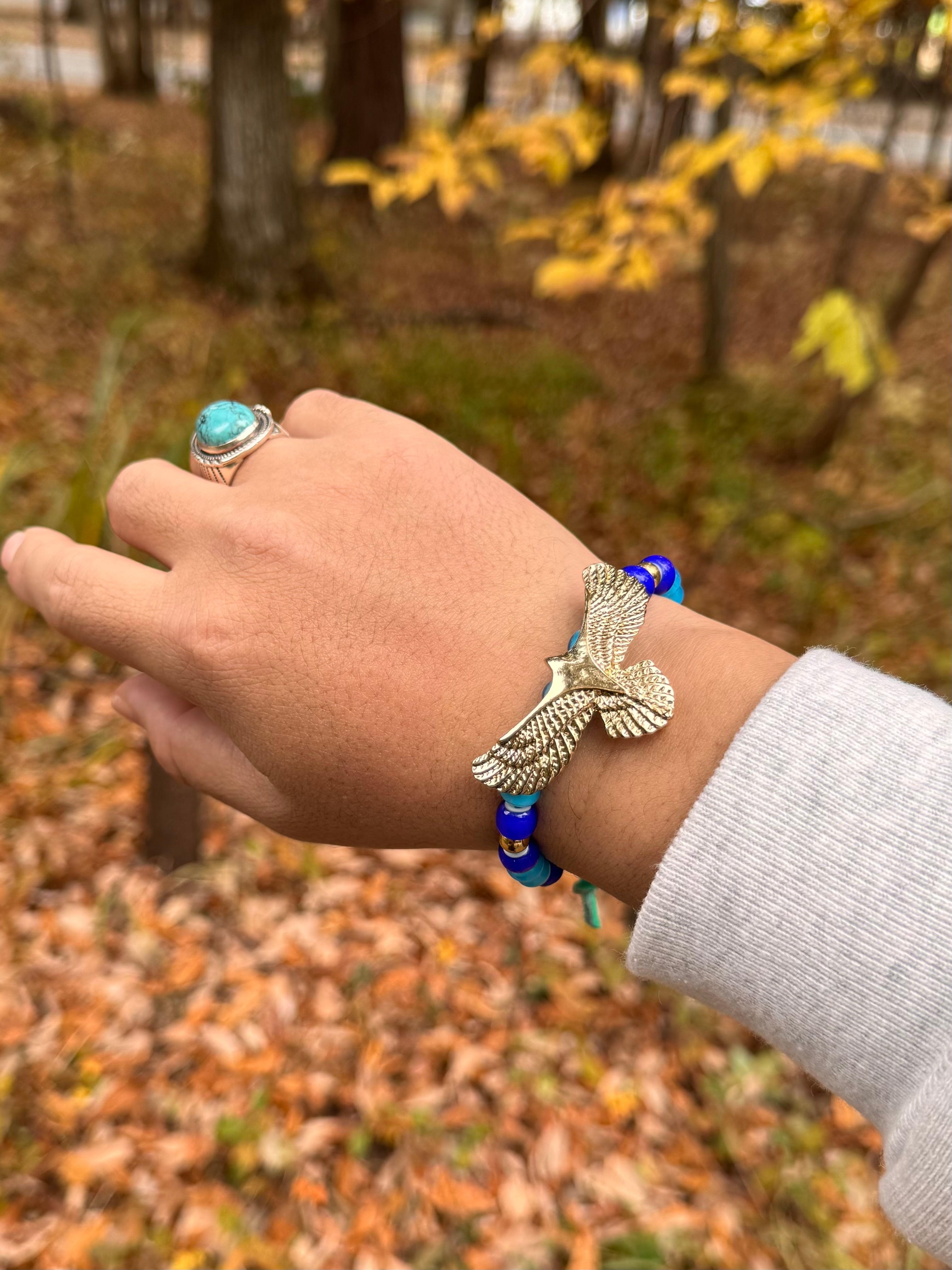 ★このブレスレットは、ネイティブアメリカンの文化を反映したデザインで、中心にイーグルモチーフを配置し、ホワイトハーツのビーズを使用したハンドメイドの特別なアイテムです!