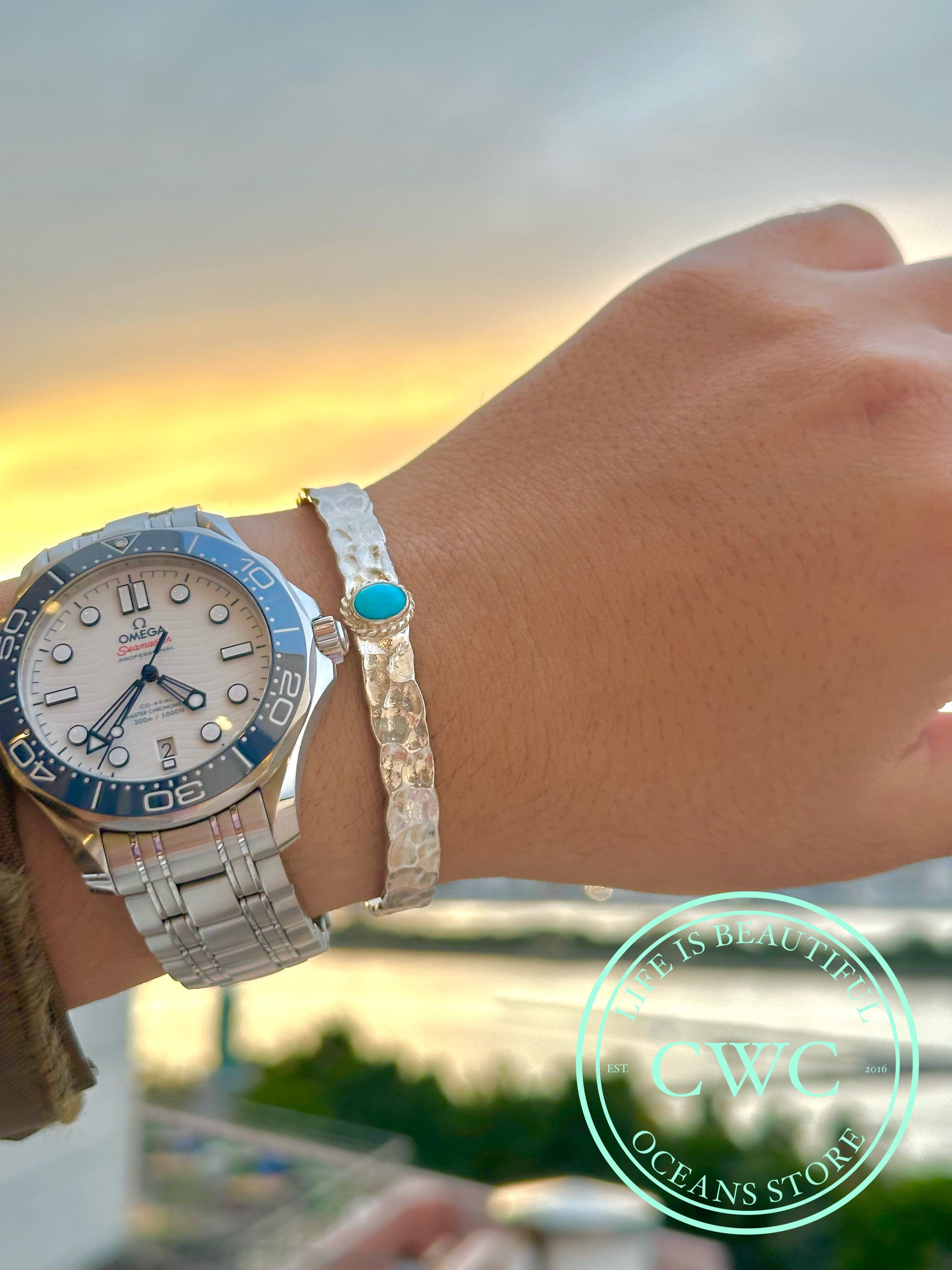 ・このシルバー925製のバングルは、美しいターコイズを贅沢に使用しており、その独特の彩りがまるでハワイの海を思い起こさせるようです!一点もののデザインは、他にはない特別感を演出します(๑˃̵ᴗ˂̵)