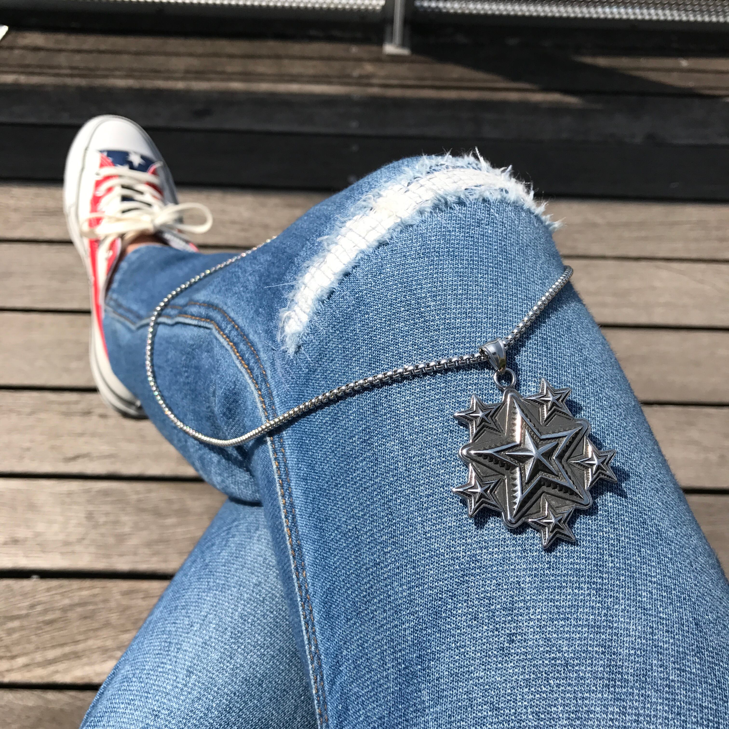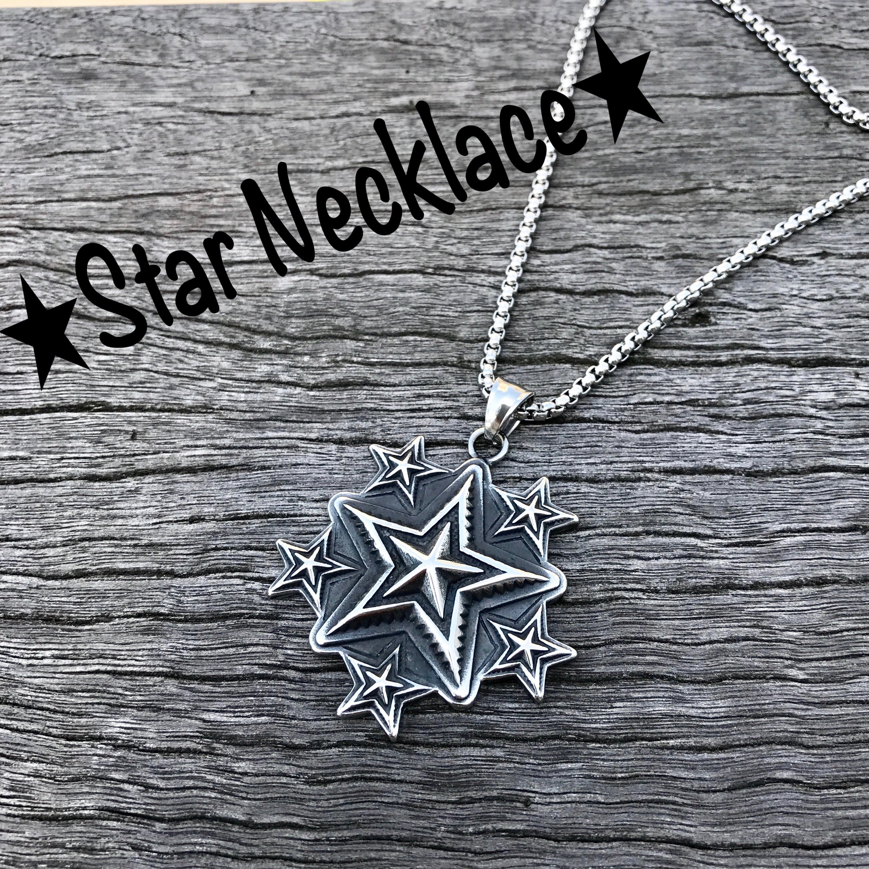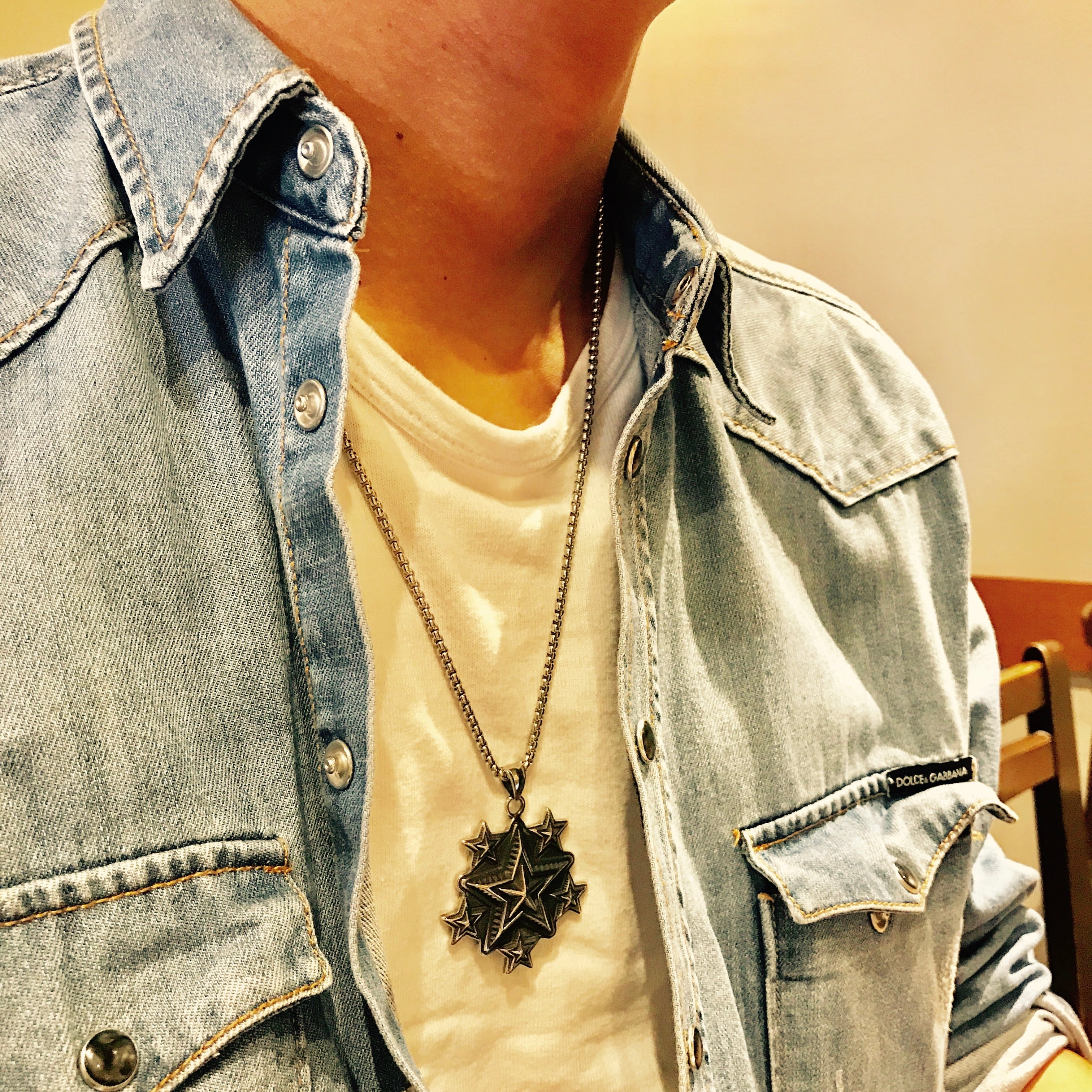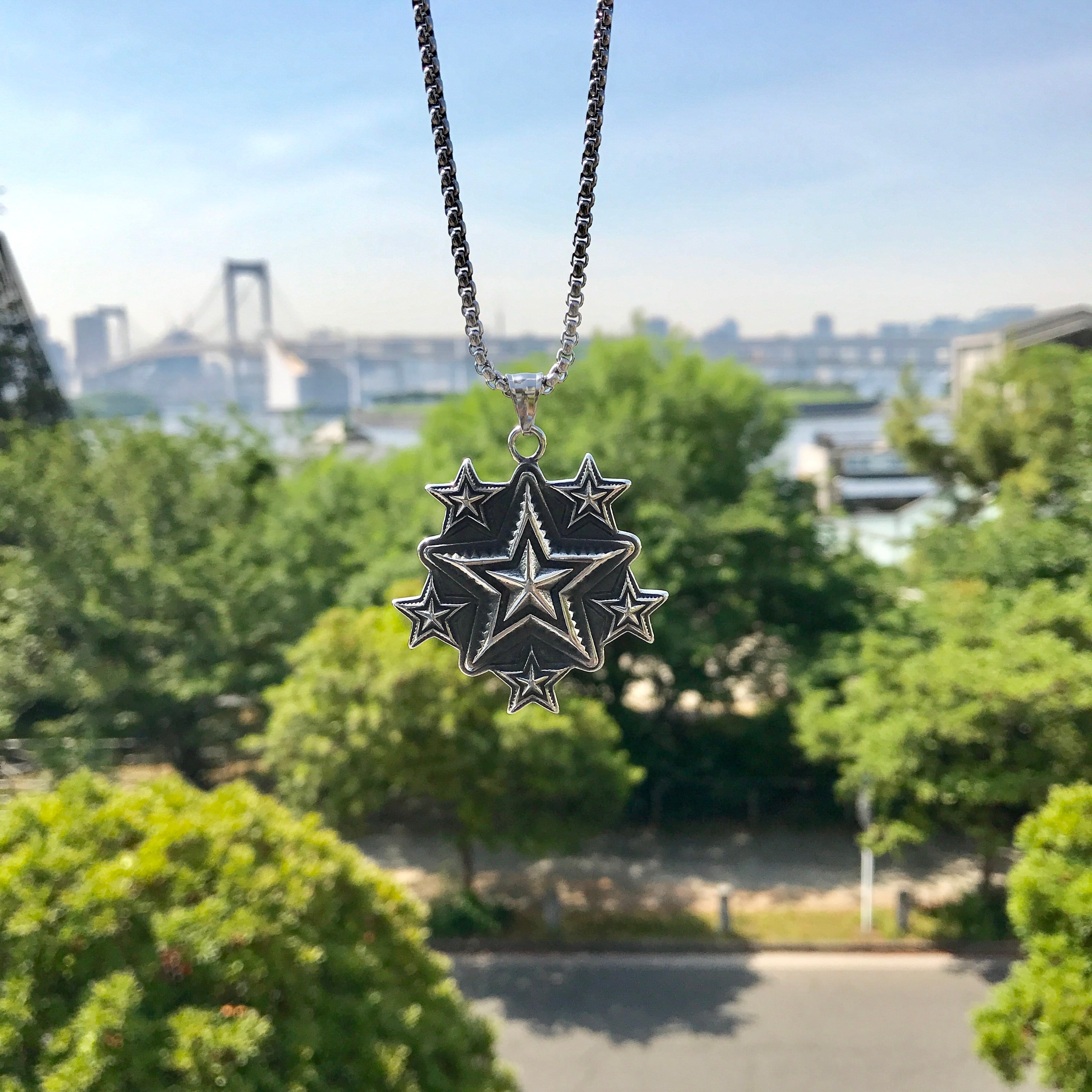 「ステンレス製ラージ6スターネックレス」です。ボリュームがあり存在感のあるネックレスをシンプルコーデの胸元に☆視線を・・・★集める事間違いなし★