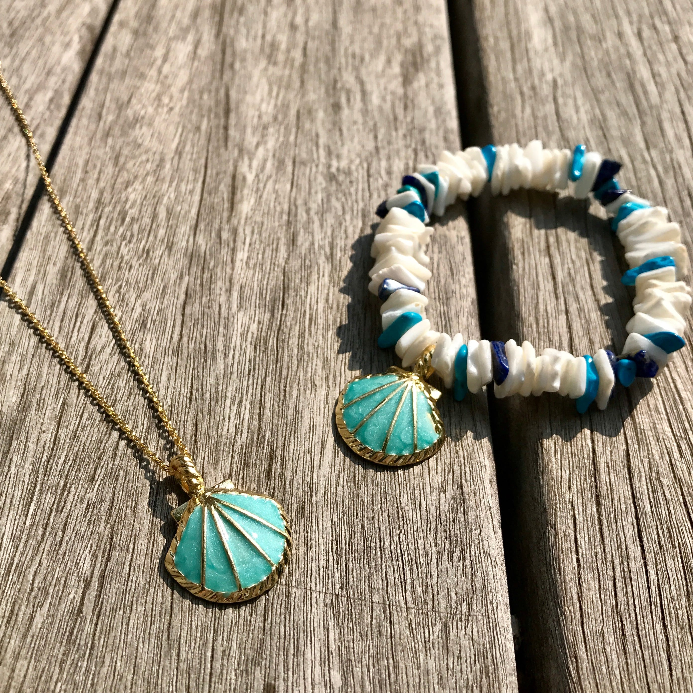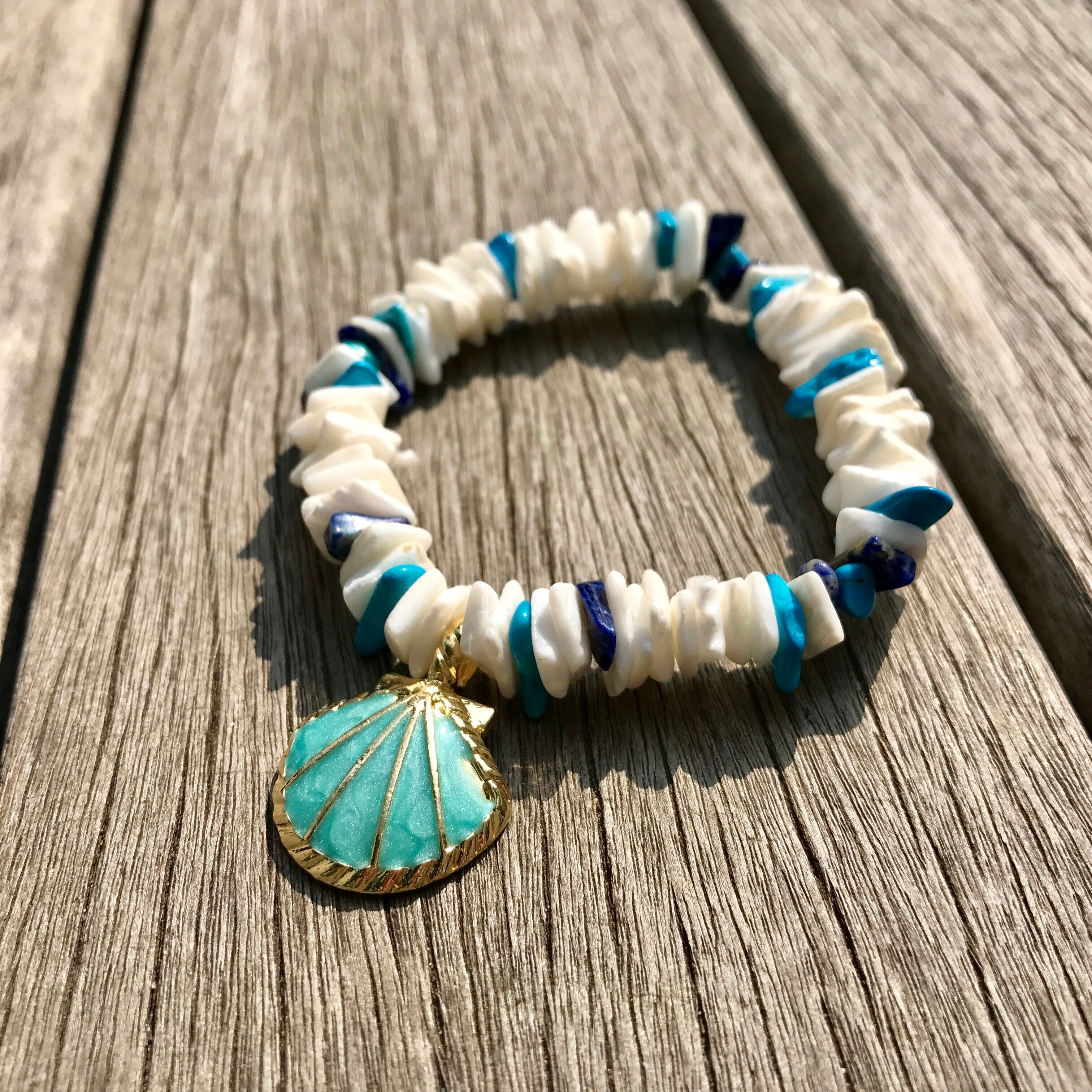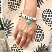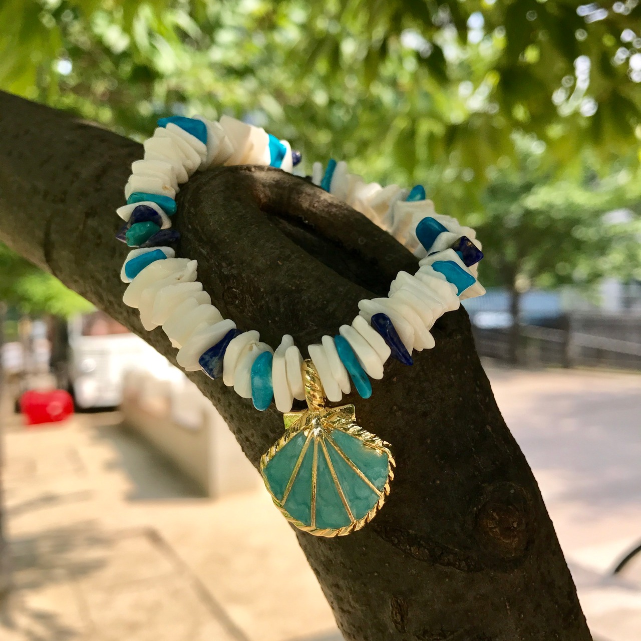 シェルを使用して、色合いも夏にピッタリ!!!の爽やかな印象を与えてくれるブレスレットです。