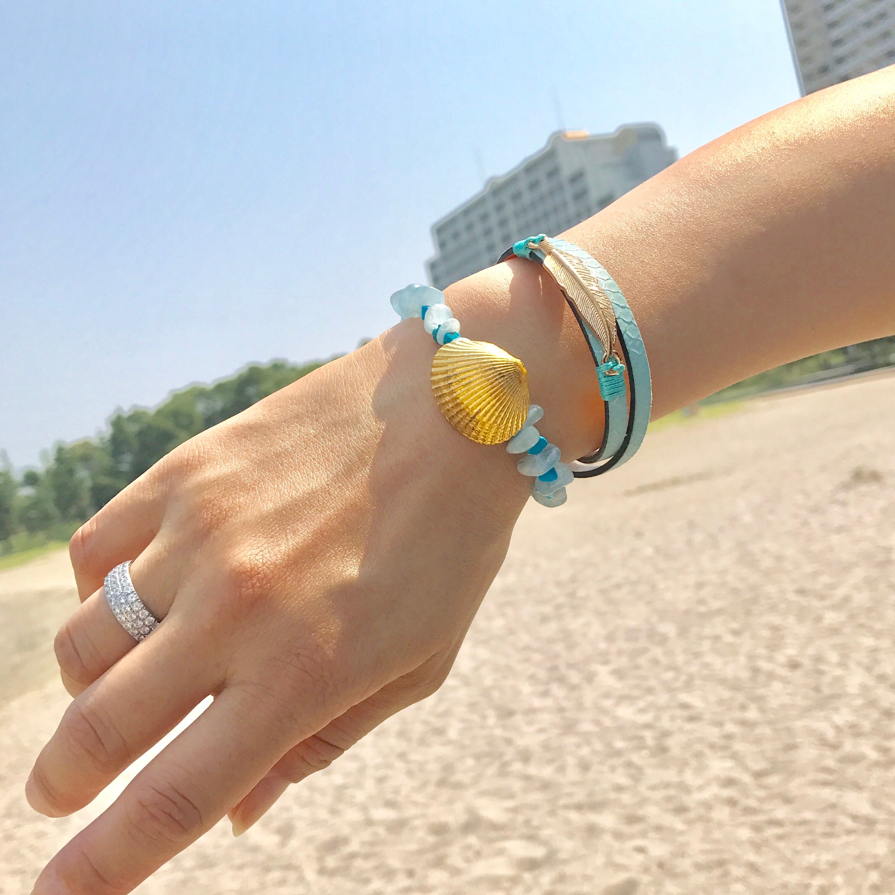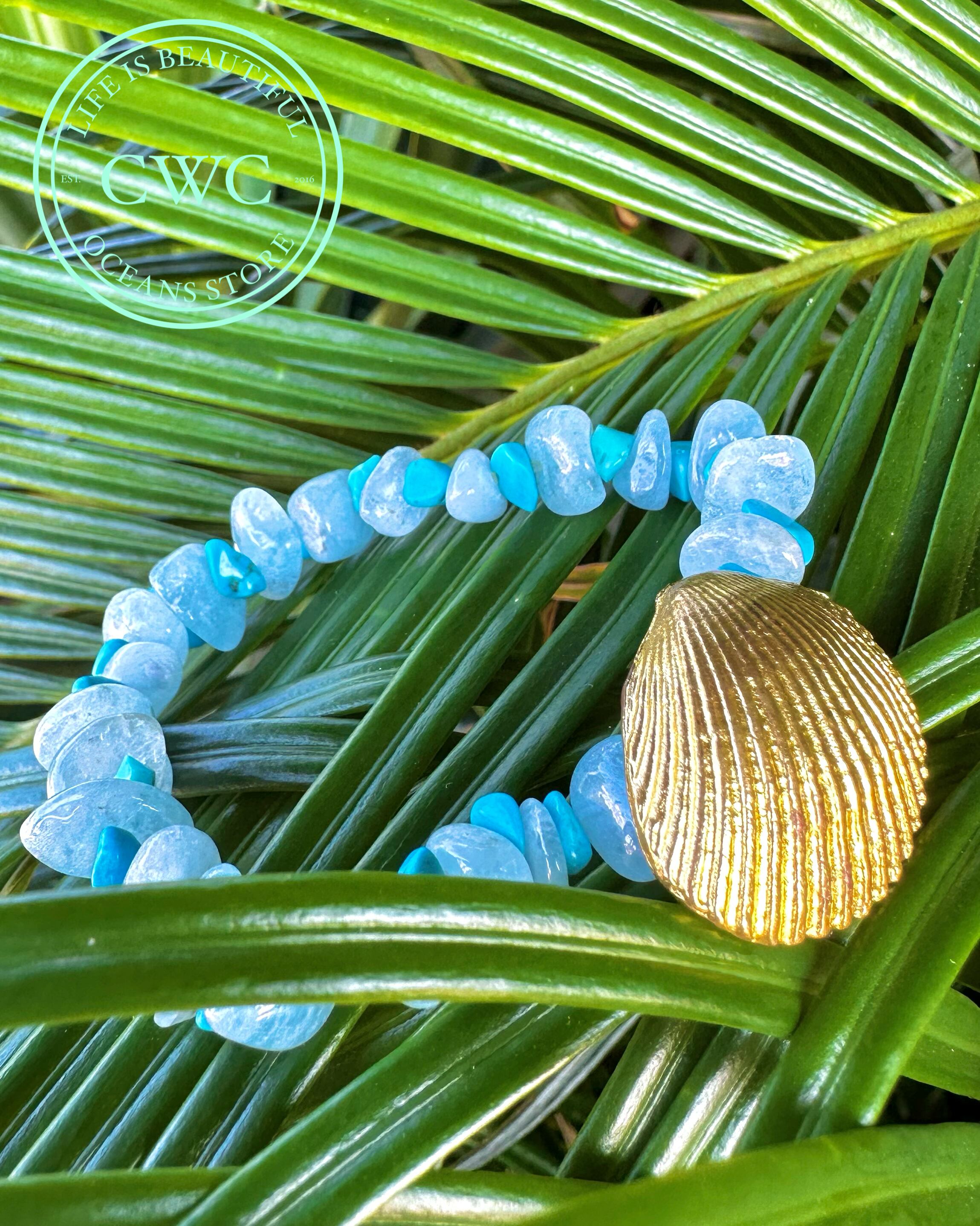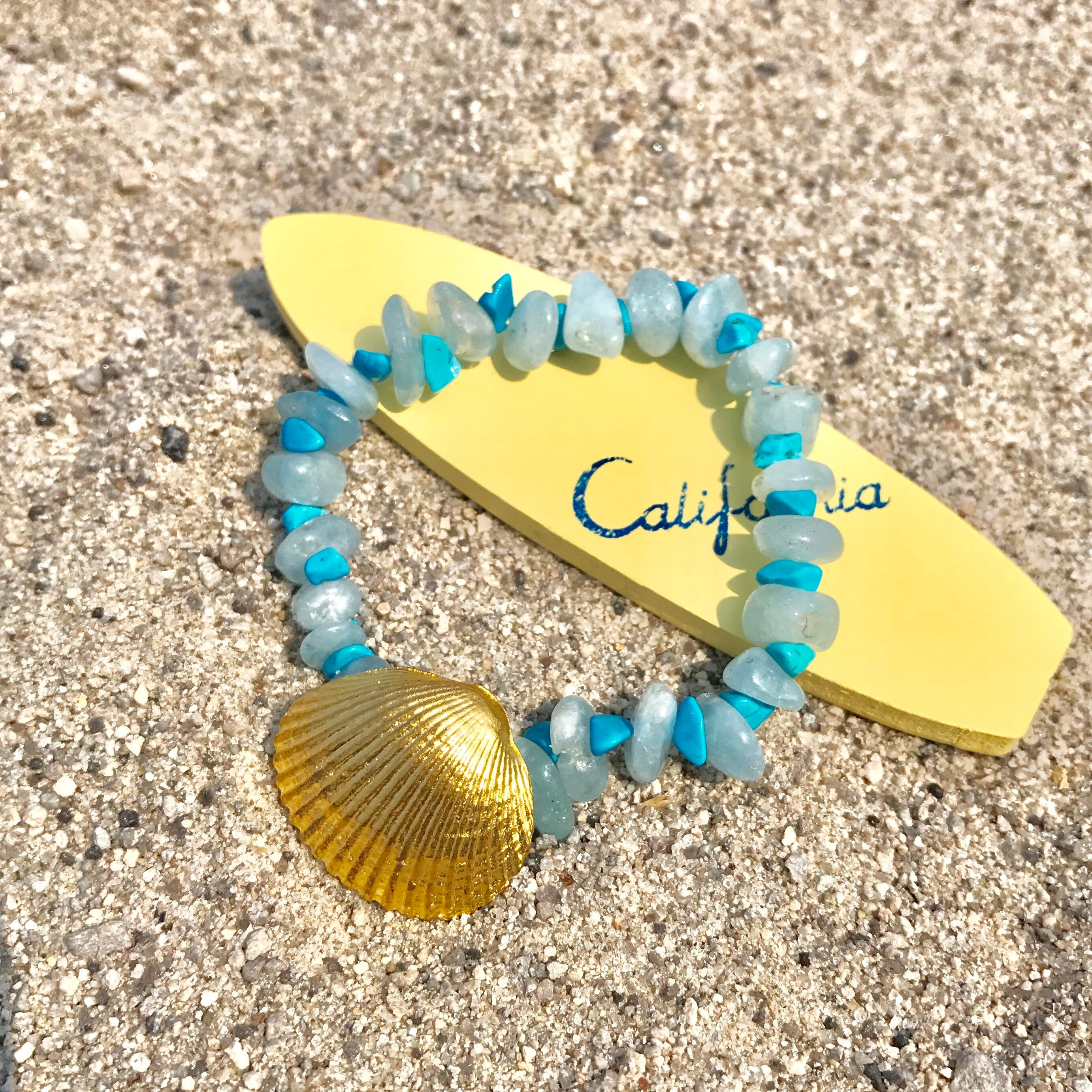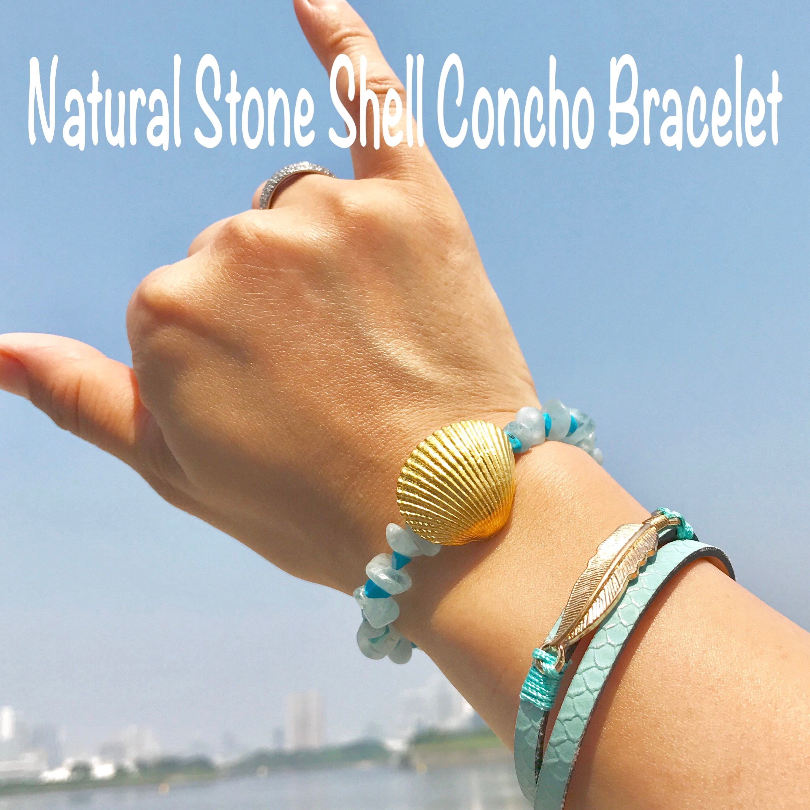 ★Natural Stone Shell Cocho Bracelet ~爽やかで美しい、特別なハンドメイドブレスレット❗️アクアマリンとターコイズの天然石を使用⭐︎