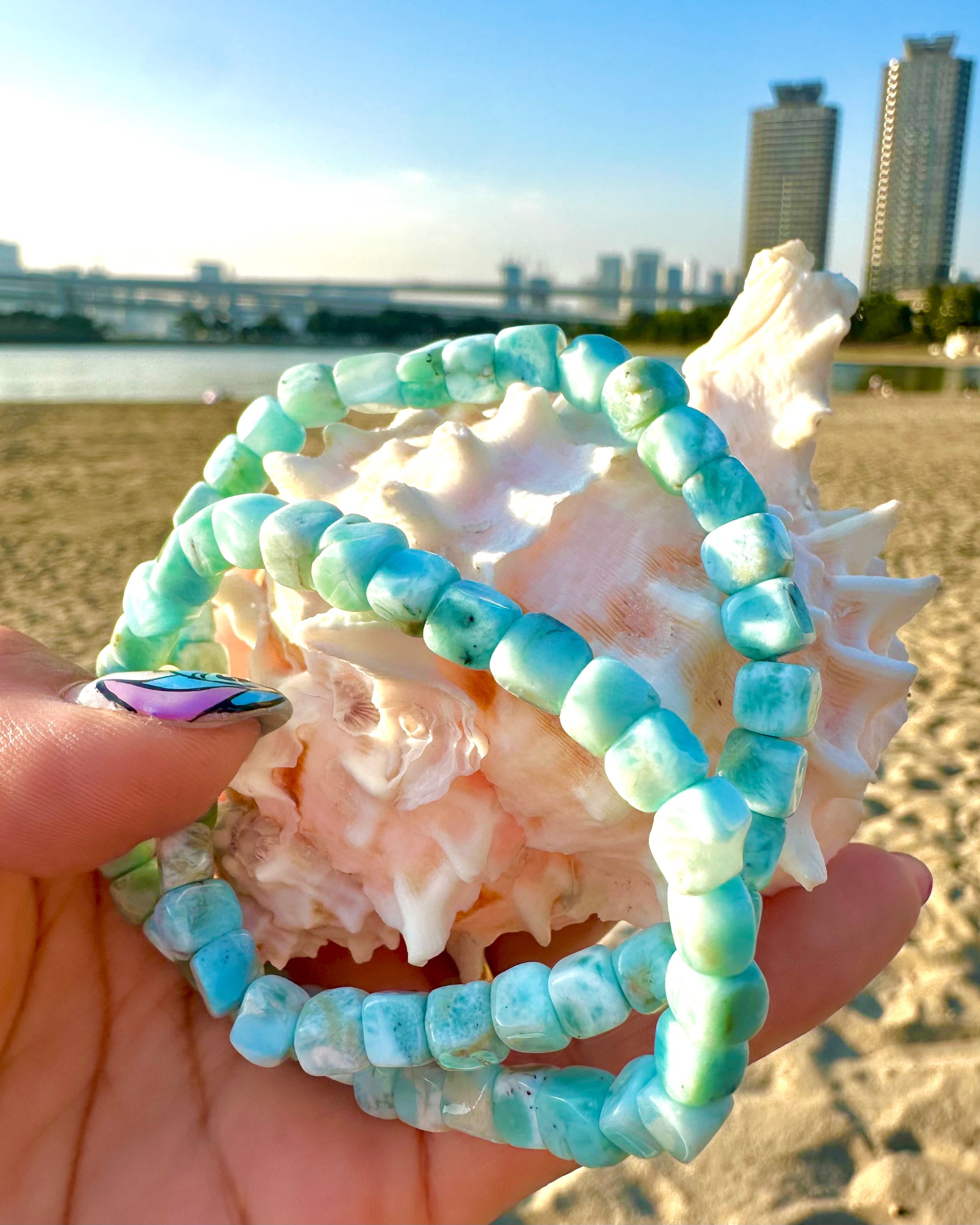 ★美しさと希少性を兼ね備えたLarimar cube braceletキューブ型の珍しい形状と、ラニカイブルーの美しい色合いが魅力の一点もの天然石ブレスレットです。ユニセックスでお使いいただけるデザインで、ファッションのアクセントとして大活躍間違いなし☆